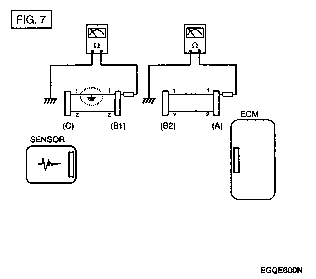 b. Disconnect connector (B), and measure the resistance between connector (A) and chassis ground, and between (B1) and chassis ground as shown in [FIG. 7].