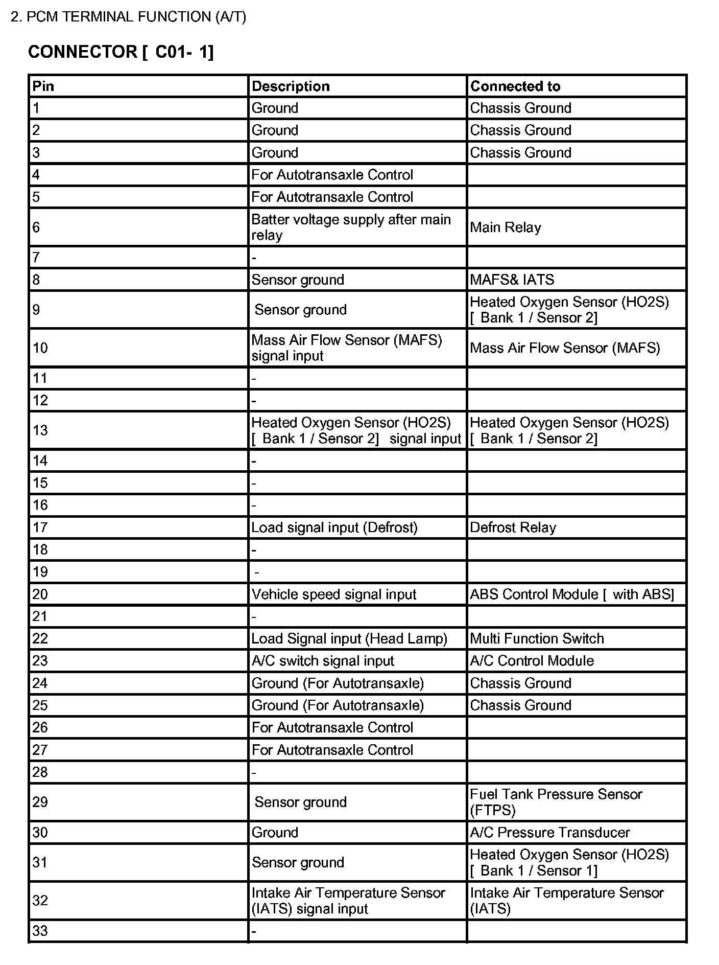 PCM TERMINAL FUNCTION (A/T) - CONNECTOR [C01-2]