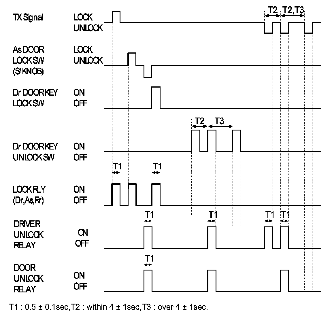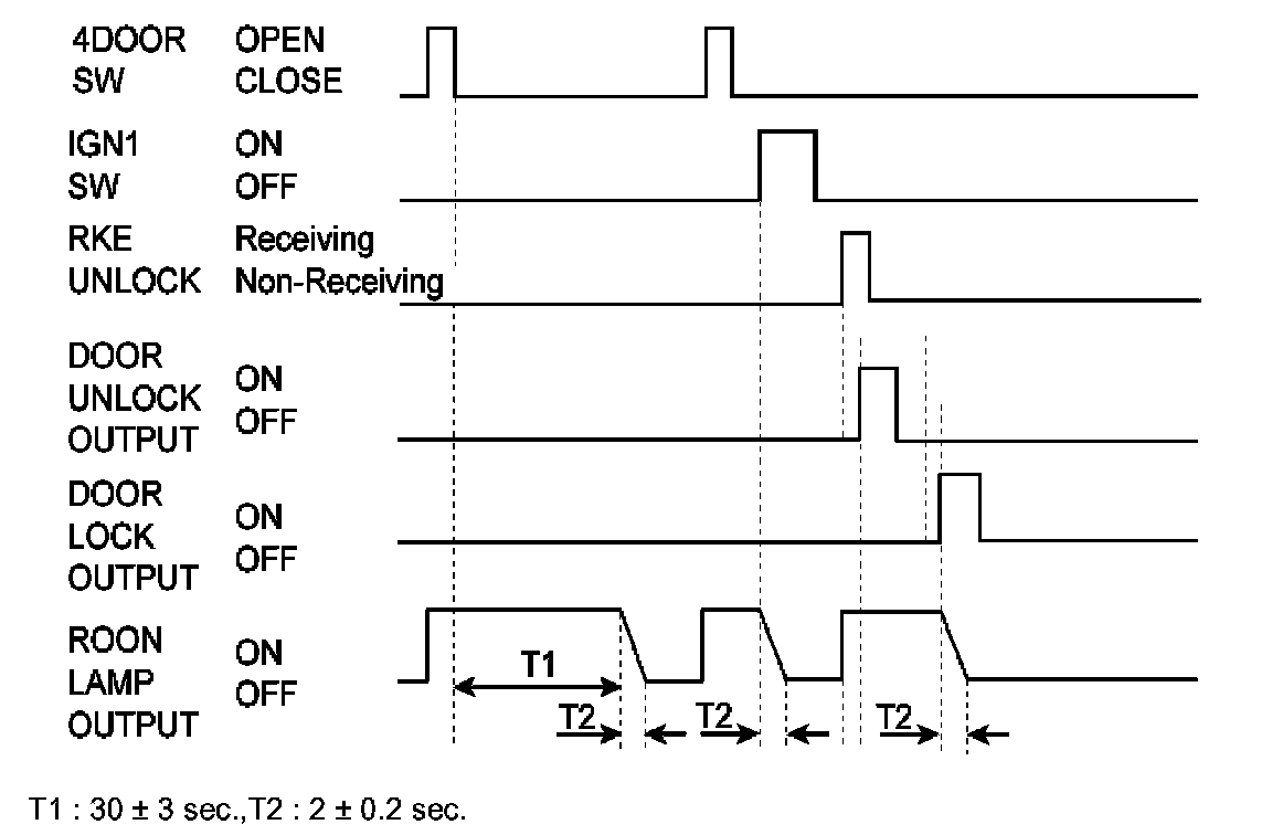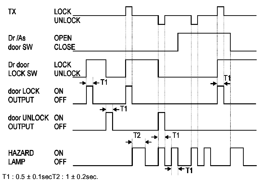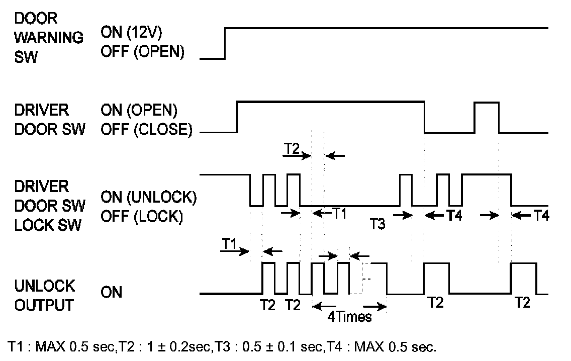 f. When the TX Unlock signal is received, the driver door Unlock output shall be ON for T1.If the TX Unlock signal is received within T2, the Unlock output shall be ON to all doors for T1. (After the driver door Key Unlock switch is turn to ON from OFF, if the same condition is satisfied within T2, then the Unlock output shall be ON to all doors.)
