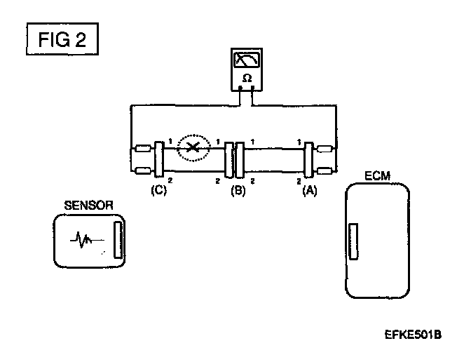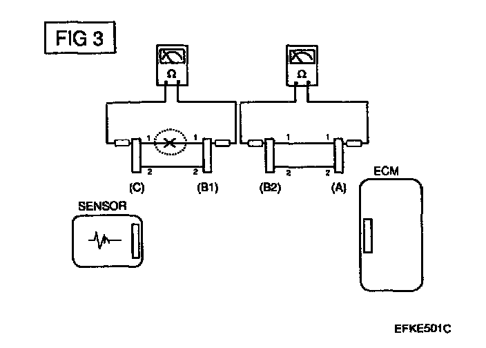 a. Disconnect connectors (A), (C) and measure resistance between connector (A) and (C) as shown in (FIG. 2].