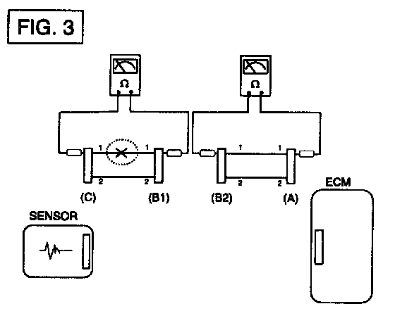 b. Disconnect connector (B), and measure for resistance between connector (C) and (B1) and between (B2) and (A) as shown in [FIG. 3].