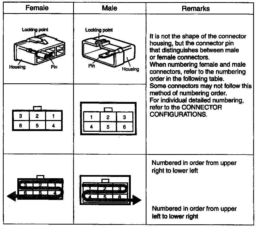NOTE: Connectors which connect each wiring harness are represented by the symbols as in below diagram.