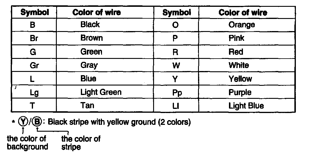 The abbreviations are used to identify wire colors in the circuit schematics.