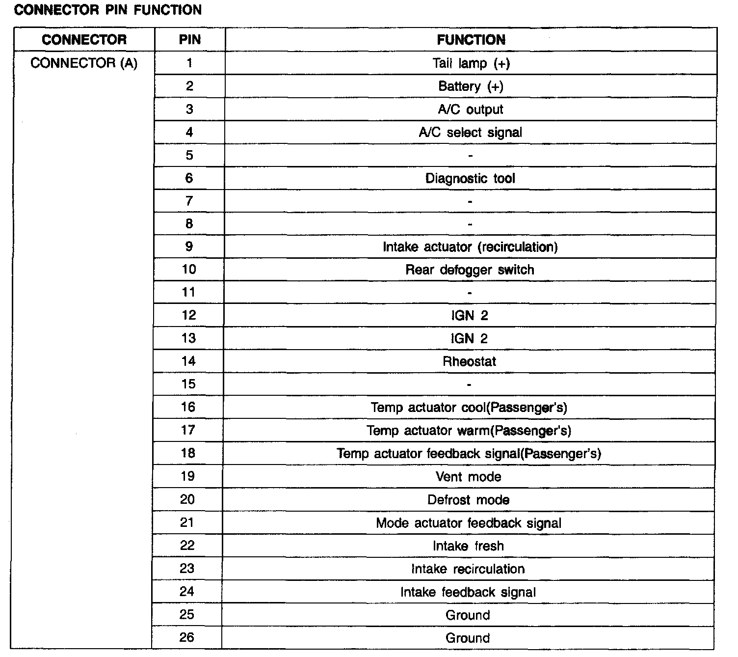 Connector Pin Function - Connector (A):