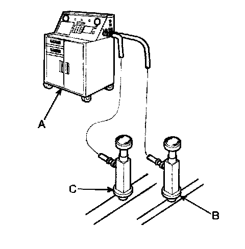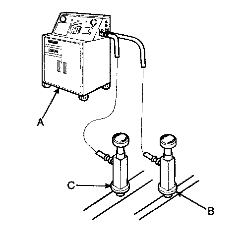 1. Connect an R-134a refrigerant Recovery/Recycling/charging System (A) to the high-pressure service port (B) and the low-pressure service port (C) as shown, following the equipment manufacturer's instructions.