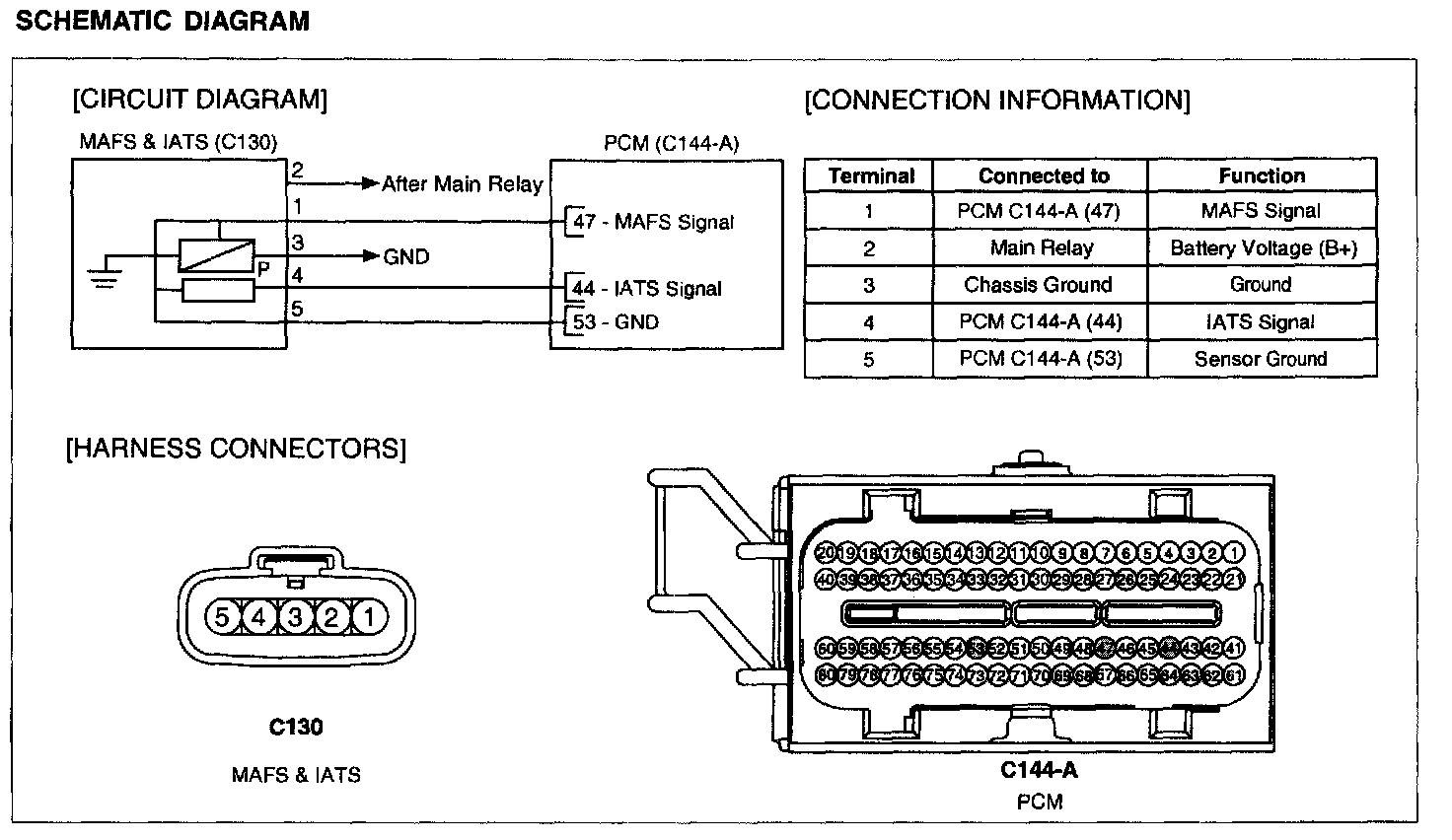 Mass Air Flow Sensor (MAFS) is a hot-film type sensor and is located in between the air cleaner and the throttle body. It consists of a tube, a sensor assembly and honey cell and detects intake air quantity flowing into the intake manifold. While the intake air coming out of the air cleaner flows by the honey cell, it becomes laminar flow, and then it passes the hot-film. At this time, heat transfer is generated by convection and this sensor loses its energy. This sensor detects the mass air flow by using the energy loss and transfers the information to the PCM by frequency. The PCM calculates fuel quantity and ignition timing.