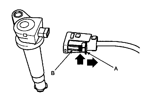 NOTE: When removing the ignition coil connector, pull the lock pin (A) and push the clip (B).
