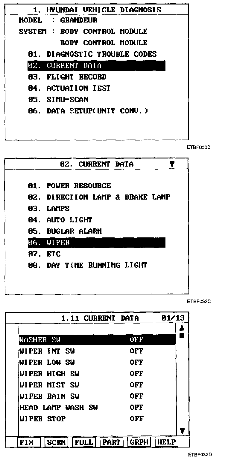 3. Select "Current data", if you will check current data of BCM. It provides power supply status, multifunction status, lamp status, door status, lock system status, wiper, auto light status and so on.