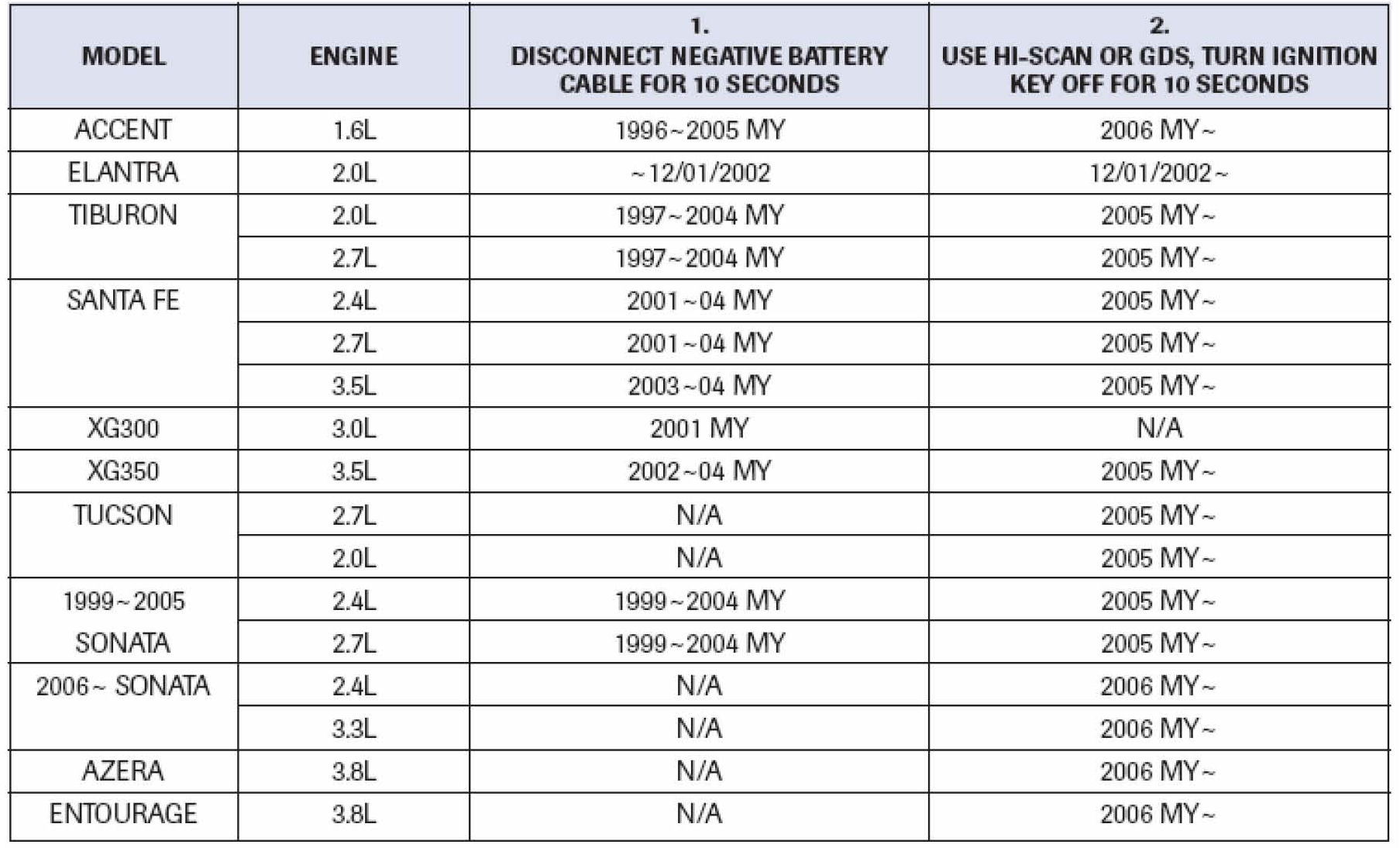 Adaptive values must be reset using procedure # 1 or # 2 according to model and model year (MY) as shown below.