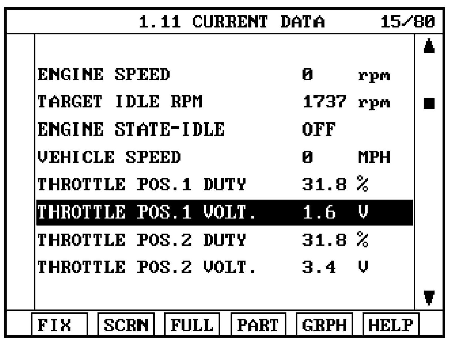 3. Attach a Hi-Scan Pro or GDS and select "Engine" menu, "Current Data" menu and throttle position sensor in volts ("THROTTLE POS. SENSOR", "ACCEL. P0S. S", or "ACCEL PEDAL 1 VOLT", depending on model).