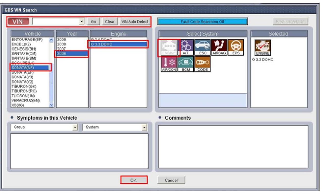 2. Enter the vehicle information by pressing the VIN Auto Detect button, entering the vehicle's VIN or selecting the vehicle model, model year, engine/fuel type and ENGINE as the system and then click OK.