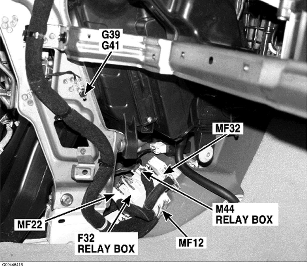 | Relay Box | Behind right front of center console. See Figure. |