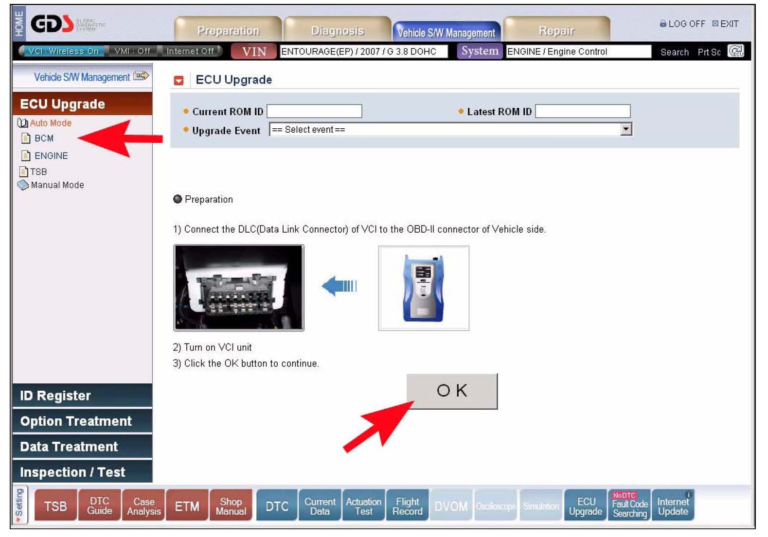 7. In the left column of the following ECU Upgrade screen select Auto Mode followed by BCM, then the OK button.