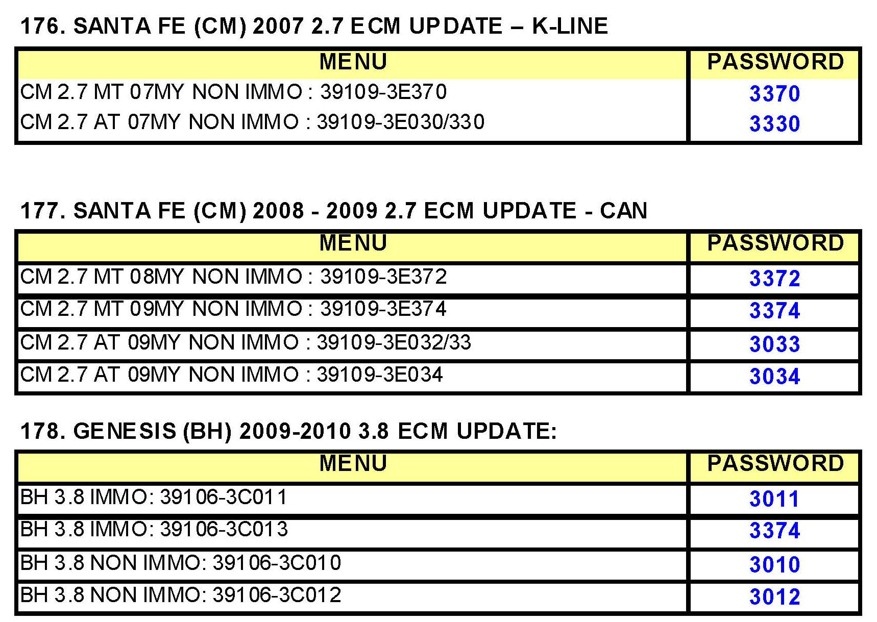 Refer to the following tables for Santa Fe and Genesis as to applicable ROM-IDs.