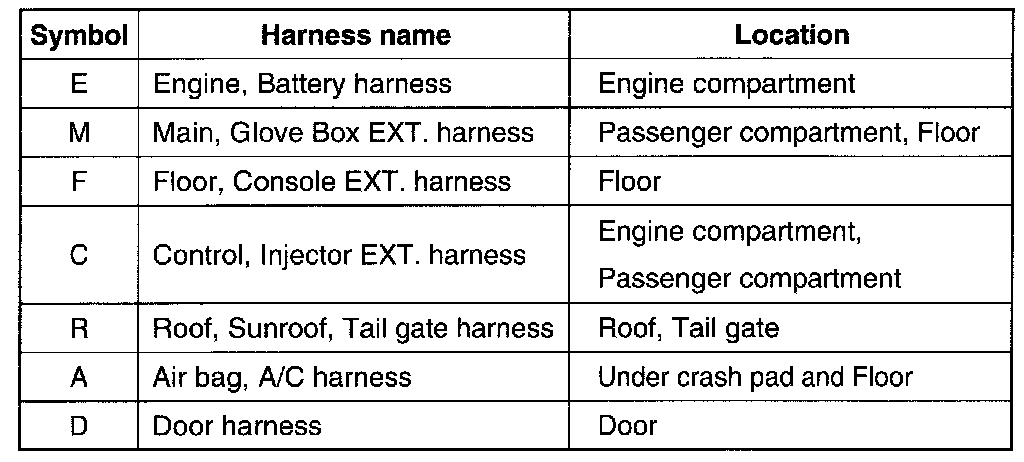 - It depends on vehicles, it is necessary to check the harness name symbol on the harness layouts for detailed symbol.