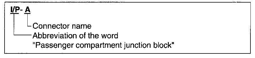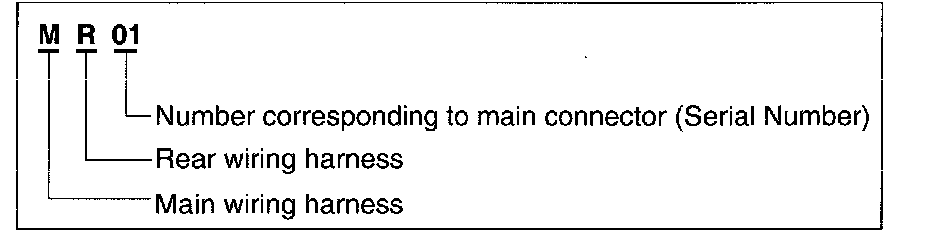 A connector identification symbol consists of a wiring harness location classification symbol corresponding to a wiring harness location and number corresponding to the connector.