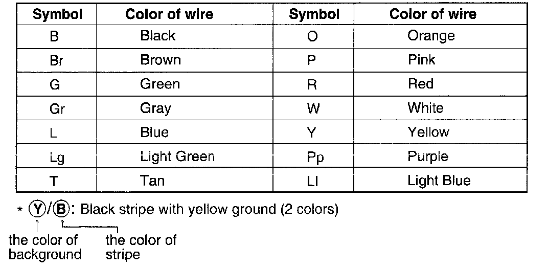 The following abbreviations are used to identify wire colors in the circuit schematics.