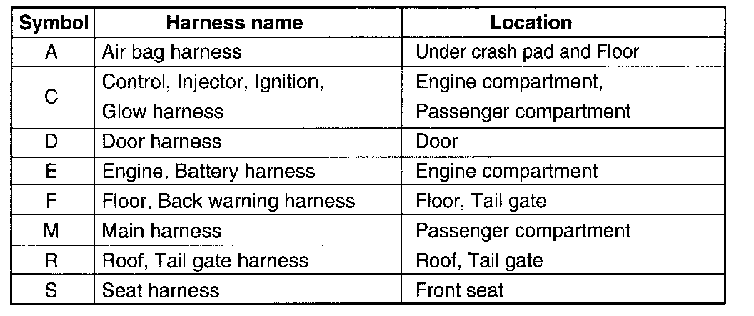 - It depends on vehicles, it is necessary to check the harness name symbol on the harness layouts for detailed symbol.