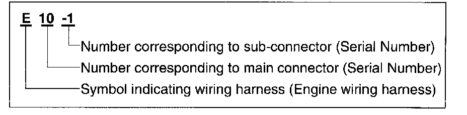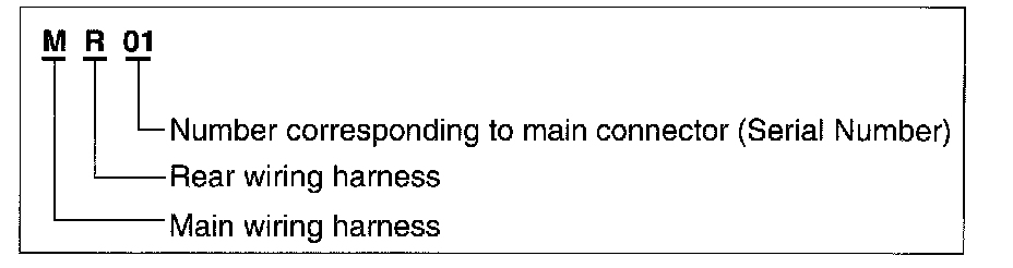 A connector identification symbol consists of a wiring harness location classification symbol corresponding to a wiring harness location and number corresponding to the connector.