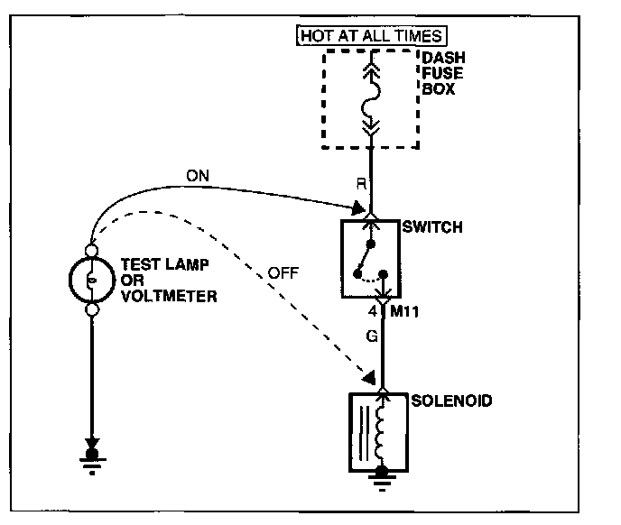 A. Connect one lead of a test lamp or voltmeter to a ground. If you are using a voltmeter, be sure it is the voltmeter's negative test lead you have connected to ground.