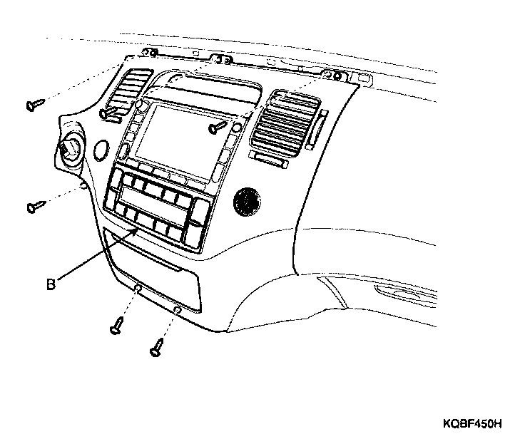 5. Loosen the screw. Remove the center facia panel (A) and then disconnect the connectors.