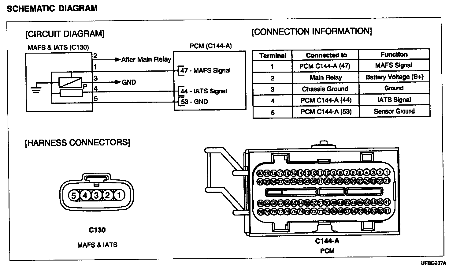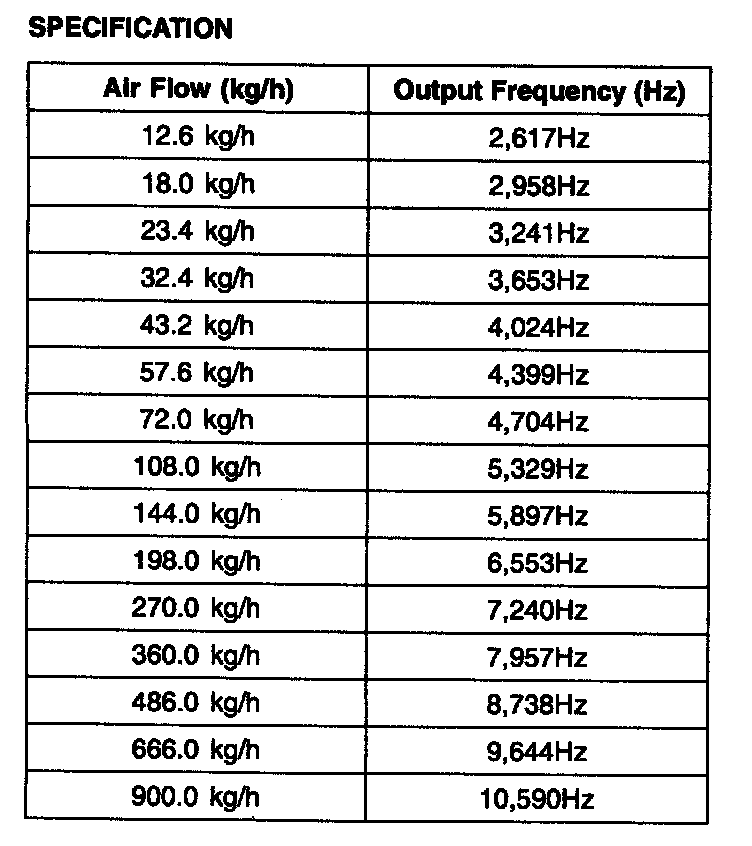 Mass Air Flow Sensor (MAFS) is a hot-film type sensor and is located in between the air cleaner and the throttle body. It consists of a tube, a sensor assembly and honey cell and detects intake air quantity flowing into the intake manifold. While the intake air coming out of the air cleaner flows by the honey cell, it becomes laminar flow, and then it passes the hot-film. At this time, heat transfer is generated by convection and this sensor loses its energy. This sensor detects the mass air flow by using the energy loss and transfers the information to the PCM by frequency. The PCM calculates fuel quantity and ignition timing.