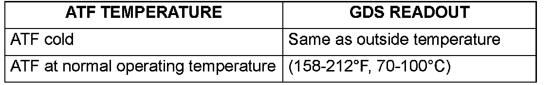 7. Attach the GDS and select "AUTOMATIC TRANSAXLE" menu, "CURRENT DATA" menu and "FLUID TEMPERATURE SENSOR". Confirm the oil temperature sensor operates correctly as shown. If not, inspect the oil temperature sensor according to TSB 04-40-016 or appropriate shop manual.