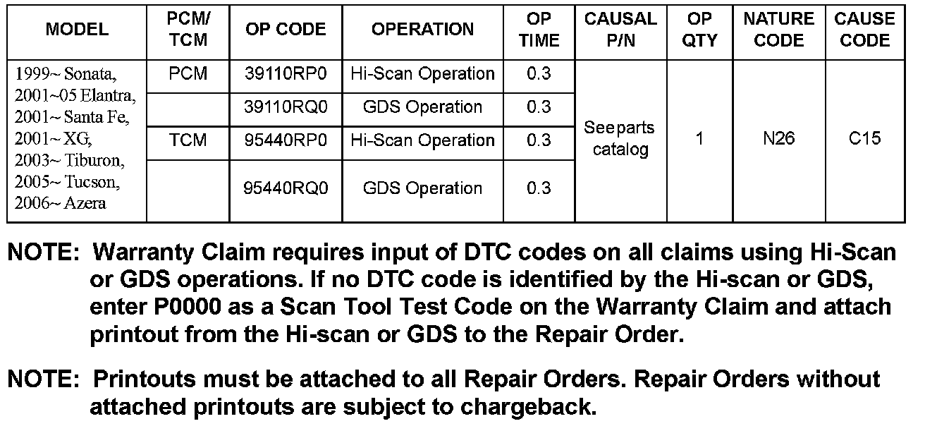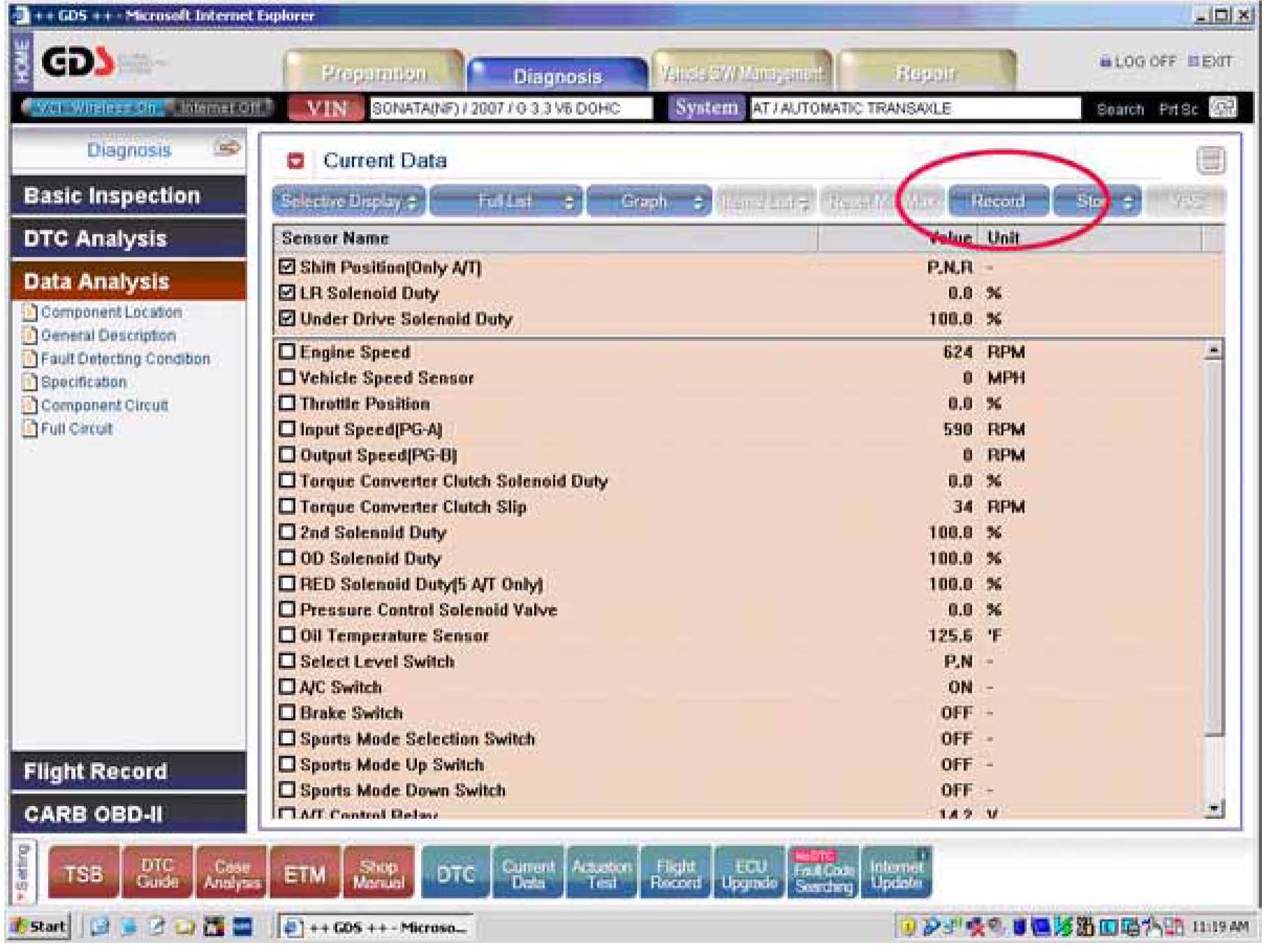 6. Attach the GDS and check for Diagnostic Trouble Codes in both the "ENGINE" and "AUTOMATIC TRANSAXLE" menus. If DTC are found, repair according to the appropriate TSB or shop manual.