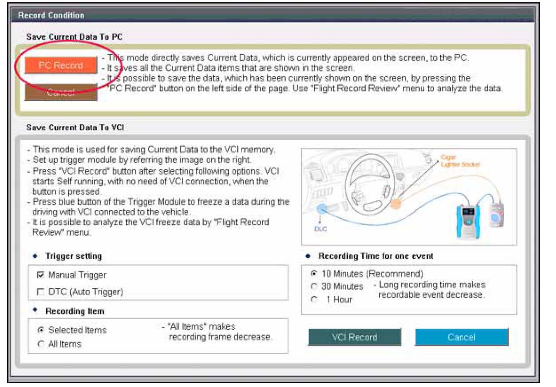 11. Select "Record shown" at the top right of the screen. GDS will record up to 10 minutes data prior to selecting "Record".