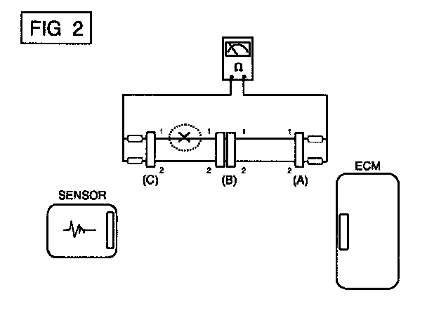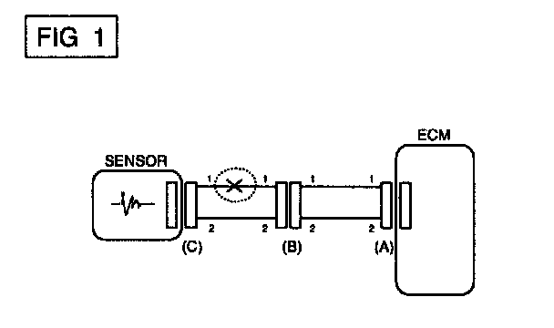 In [FIG.2.] the measured resistance of line 1 and 2 is higher than 1 Mohm and below 1 ohm respectively. Specifically the open circuit is line 1 (Line 2 is normal). To find exact break point, check sub line of line 1 as described in next step.