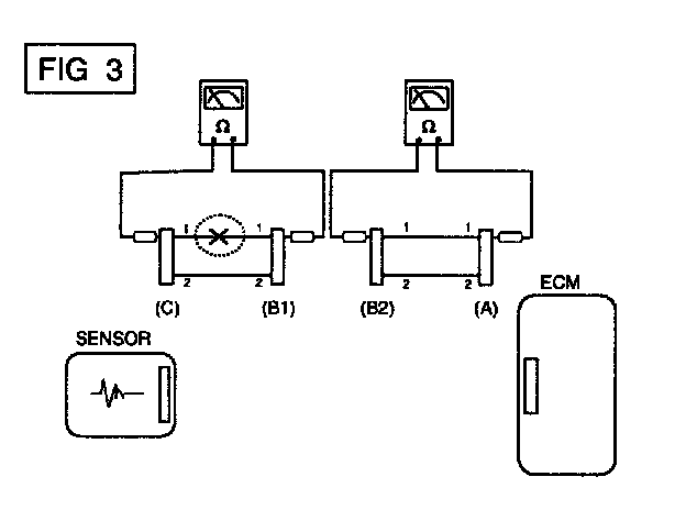 b. Disconnect connector (B), and measure for resistance between connector (C) and (B1) and between (B2) and (A) as shown in [FIG. 3].