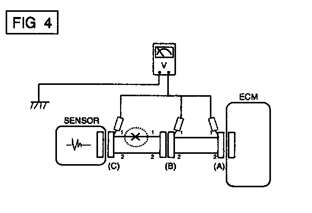 a. With each connector still connected, measure the voltage between the chassis ground and terminal 1 of each connectors (A), (B) and (C) as shown in [FIG. 4].