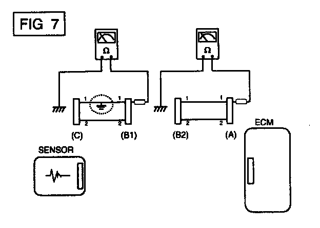 The measured resistance between connector (B1) and chassis ground is 1 ohm or less. The short to ground circuit is between terminal 1 of connector (C) and terminal 1 of connector (B1). (B2) (C) SENSOR B (B1).