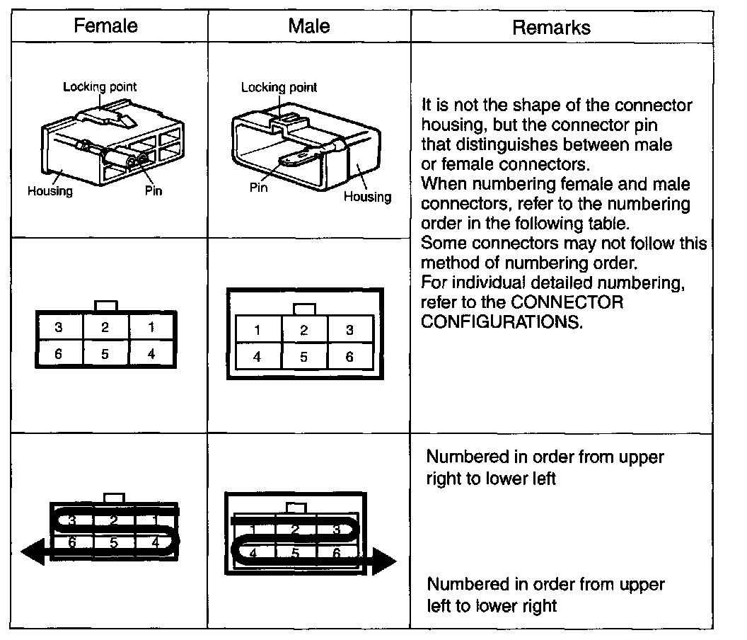 - It shows the front of the connector on the harness side when not to the harness connector. The terminal number on each connector can be obtained by following the pattern used in (5) connector view and numbering order. Unused terminals are marked with an asterisk (*).