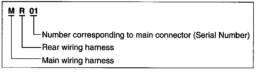 A connector identification symbol consists of a wiring harness location classification symbol corresponding to a wiring harness location and number corresponding to the connector.