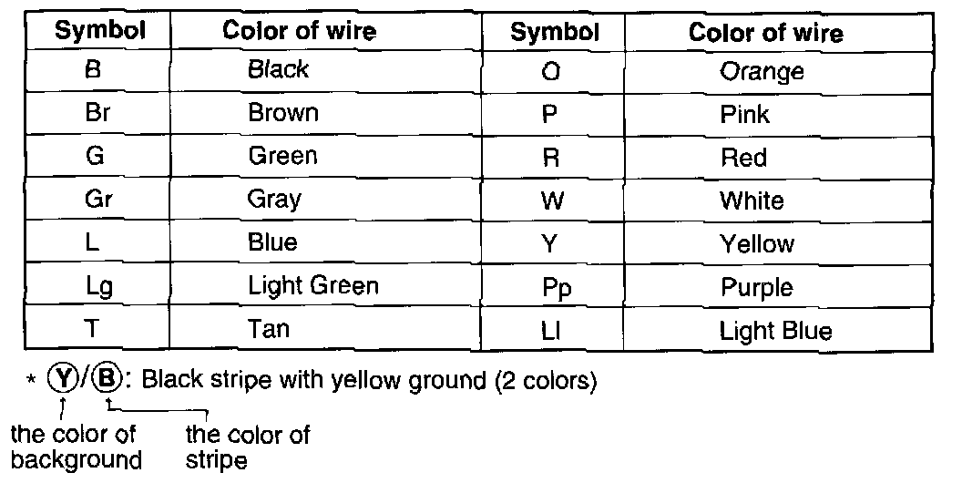 The given abbreviations are used to identify wire colors in the circuit schematics.