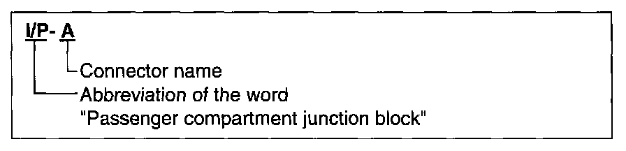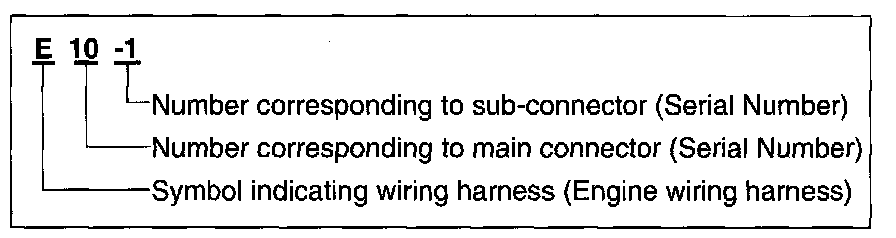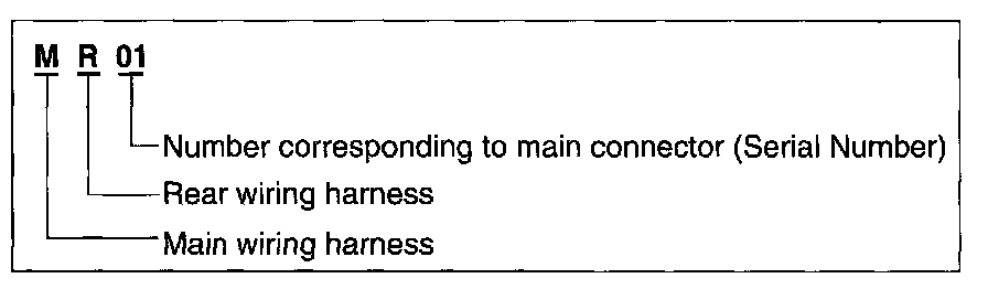 A connector identification symbol consists of a wiring harness location classification symbol corresponding to a wiring harness location and number corresponding to the connector.