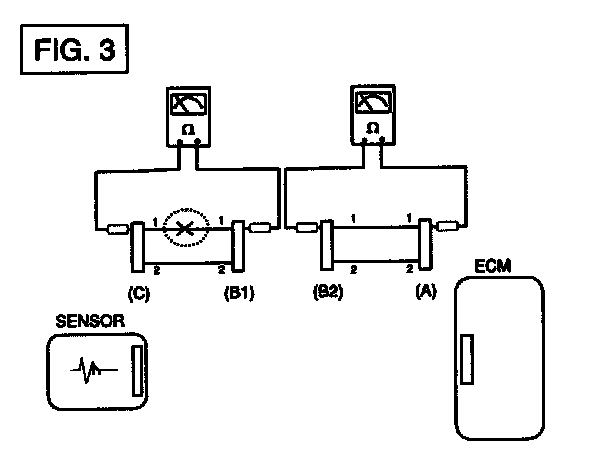 b. Disconnect connector (B), and measure for resistance between connector (C) and (B1) and between (B2) and (A) as shown in [FIG. 3].In this case the measured resistance between connector (C) and (B1) is higher than 1 Mohm and the open circuit is between terminal 1 of connector (C) and terminal 1 of connector (B1).