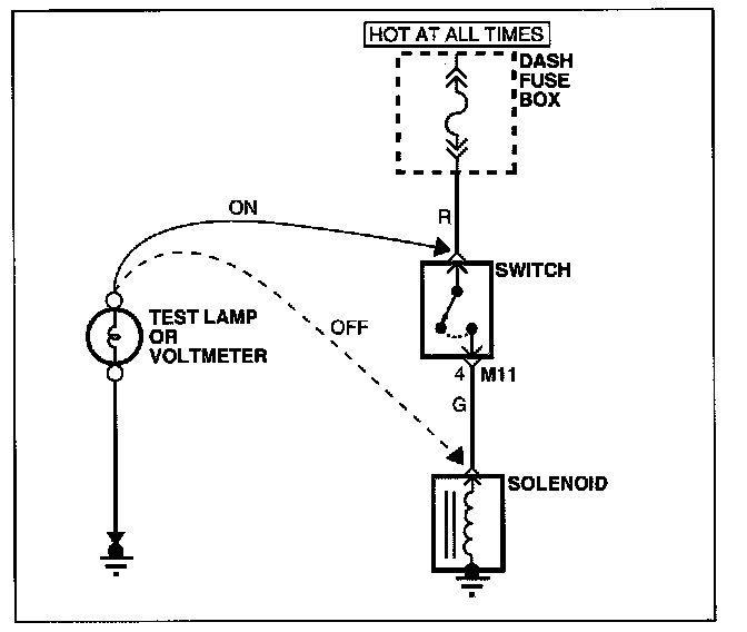 a. Connect one lead of a test lamp or voltmeter to a ground. If you are using a voltmeter, be sure it is the voltmeter's negative test lead you have connected to ground.