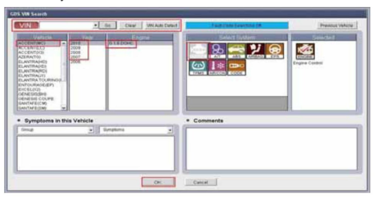2. Enter the vehicle information by pressing the VIN Auto Detect button, entering the vehicle's VIN or selecting the vehicle model, model year, engine/fuel type and ENGINE as the system and then click OK.