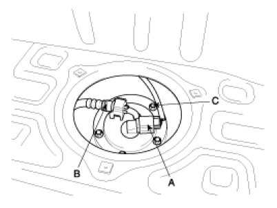 4. Unfasten the Sub Fuel Sender mounting bolts (C) and remove the Sub Fuel Sender.