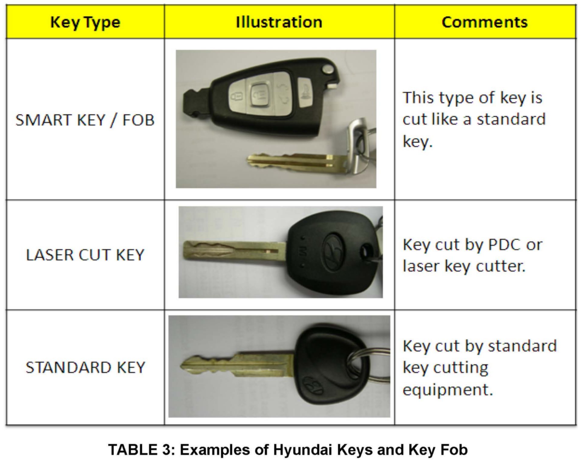Table 3 - Examples of Hyundai keys and key Fob