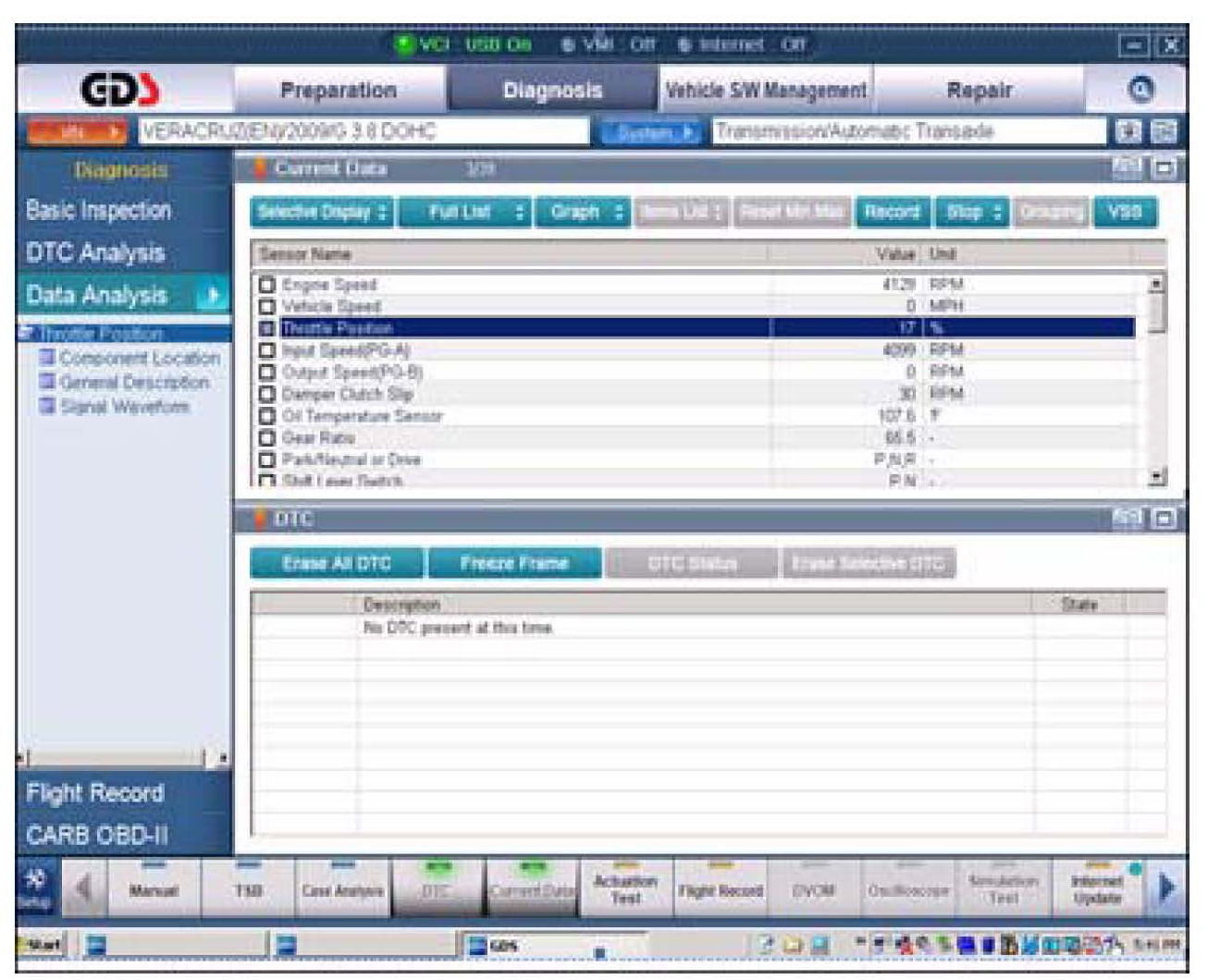 7. Request an assistant to monitor the GDS. Accelerate from a stop at the specified IPS specification while the transmission shifts through gears 1-2-3-4-5-6 and decelerate slowly to a stop. Stop for 5 seconds. Repeat 5 times.
