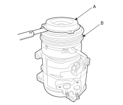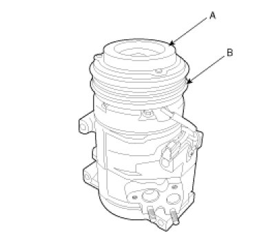 2. Check the pulley (B) bearing play and drag by rotating the pulley by hand. Replace the clutch set with a new one if it is noisy or has excessive play/drag.