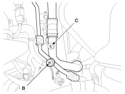 Recovery/Recycling/Charging System (A) to the high-pressure service port (B) and the low-pressure service port (C) as shown, following the equipment manufacturer's instructions.