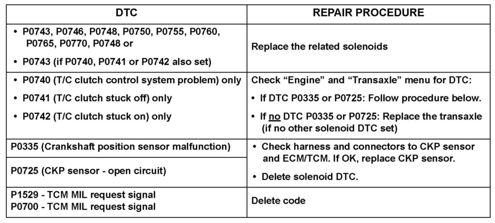 ^ Diagnostic Trouble Codes P0740, P0741, P0742, P0743, P0746, P0748, P0750, P0755, P0760, P0765 or P0770 set