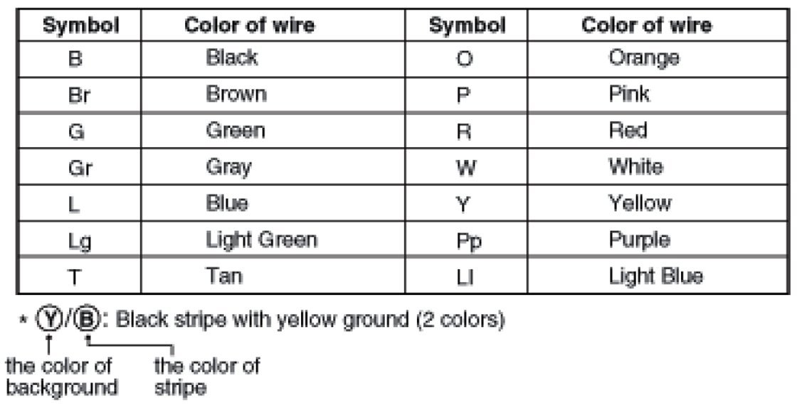 The following abbreviations are used to identify wire colors in the circuit schematics.