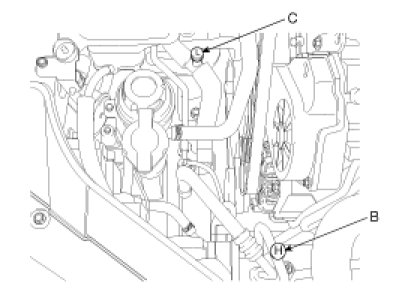1. Connect an R-134a refrigerant Recovery/Recycling/Charging System (A) to the high-pressure service port (B) and the low-pressure service port (C) as shown, following the equipment manufacturer's instructions.