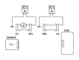 - Disconnect connector (B), and measure for resistance between connector (C) and (B1) and between (B2) and (A) as shown in [Fig 3].