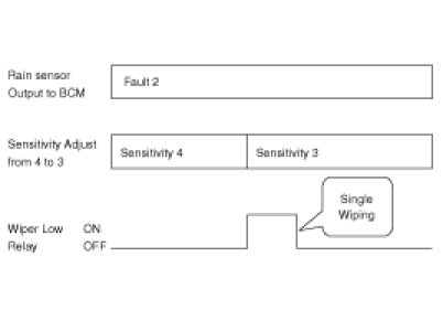 (4) The drive may adjust the rain sensor performance by adjusting the sensitivity input. When in automatic mode, the BCM will perform a single wipe each time the sensitivity is adjusted upward to a more sensitive setting (downward more then one step). This single wipe will only be performed if Rain Detected signal is being received from the Rain sensor. If the sensitivity adjustment is adjusted upward more than one sensitivity, the BCM will only perform a single wipe unless the time between Increases is more than 2 seconds.